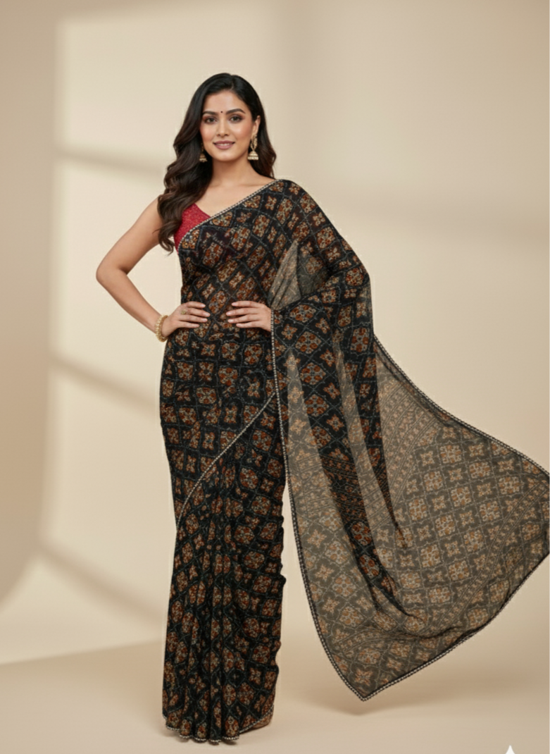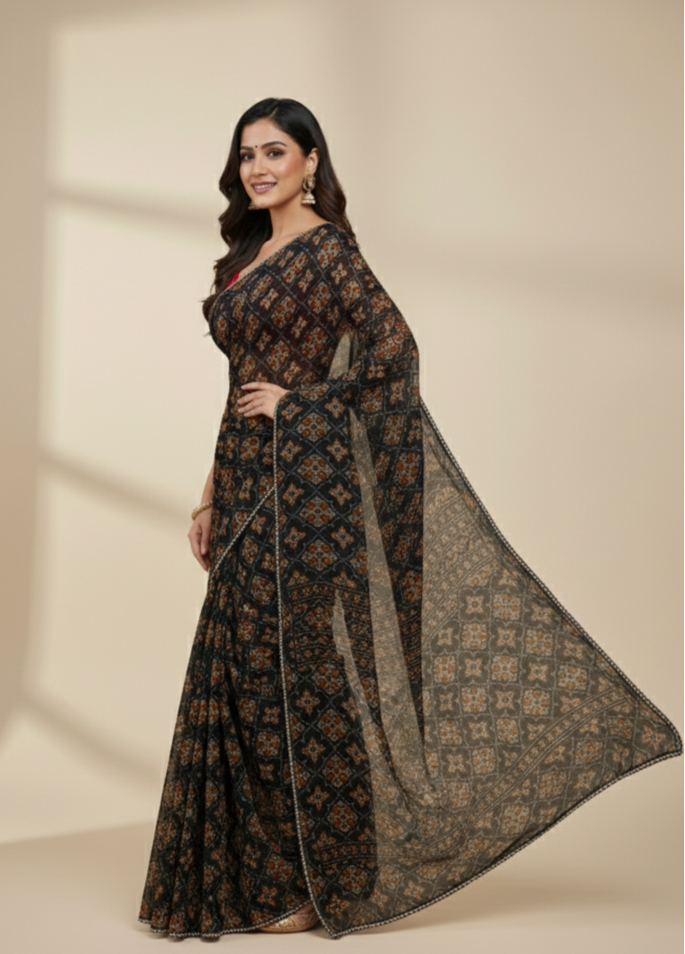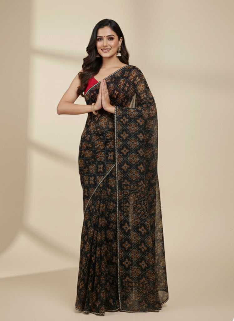 Experience timeless elegance with the Kota Doriya Ajrak Saree, a perfect blend of traditional craftsmanship and graceful style. This saree features lightweight, breathable Kota Doriya fabric woven to perfection, adorned with exquisite and classic Ajrak patterns that add cultural depth. Ideal for festive occasions or casual gatherings, it offers comfort without compromising on sophistication. Elevate your wardrobe with this unique piece that celebrates heritage while keeping you effortlessly chic.