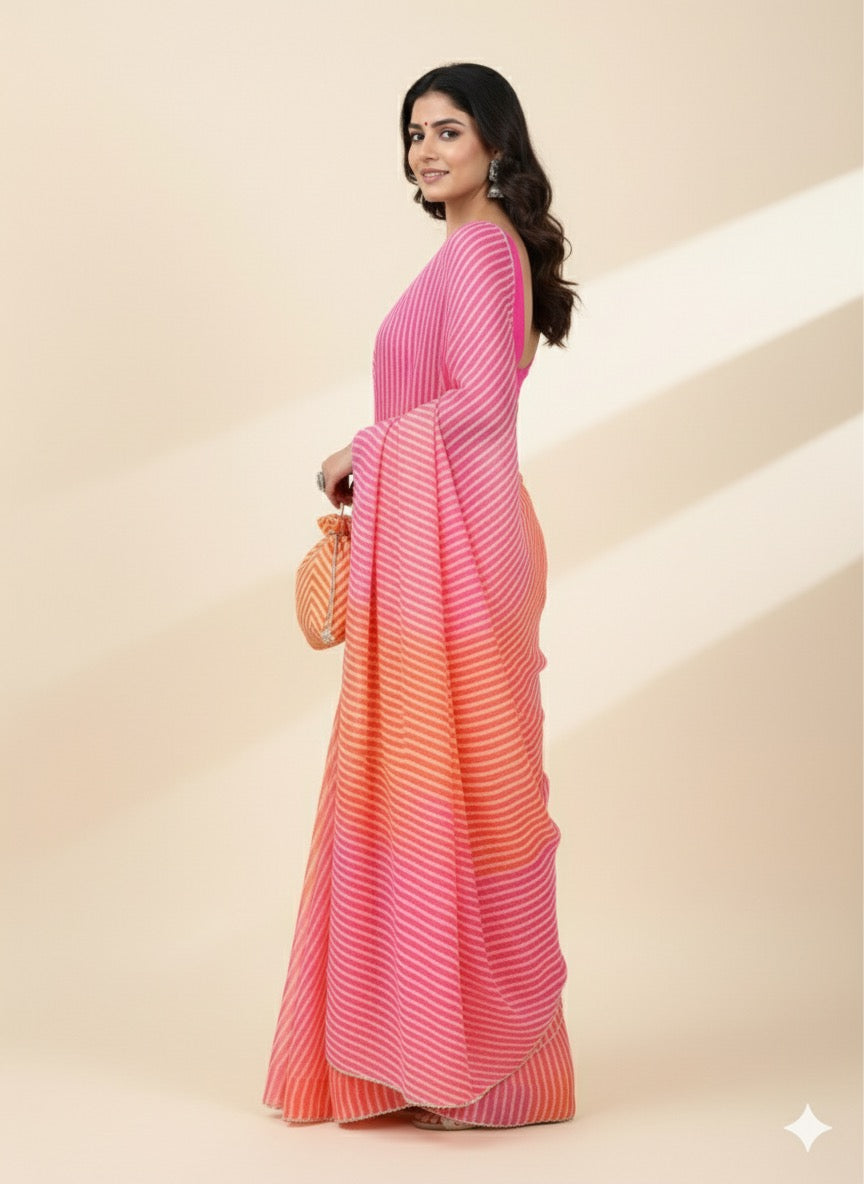 Kota Doriya Leheriya Saree is a timeless blend of tradition and craftsmanship, celebrated for its lightweight texture and distinctive patterns. Crafted with fine Kota fabric, this saree offers breathability and comfort, ideal for warm climates. Its sheer yet durable weave allows for graceful draping, enhancing the wearer’s silhouette with sophistication. This saree represents the rich heritage of Indian textiles, making it a valuable addition to any connoisseur’s collection.