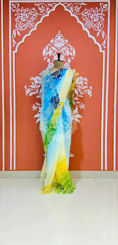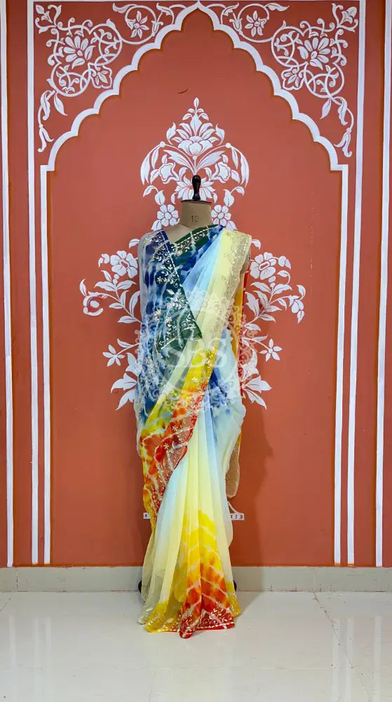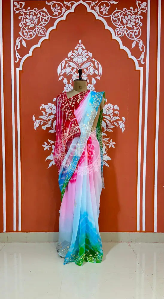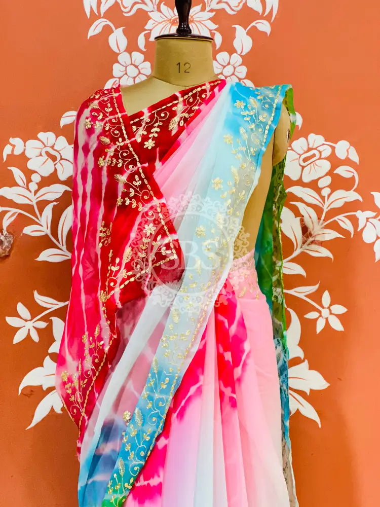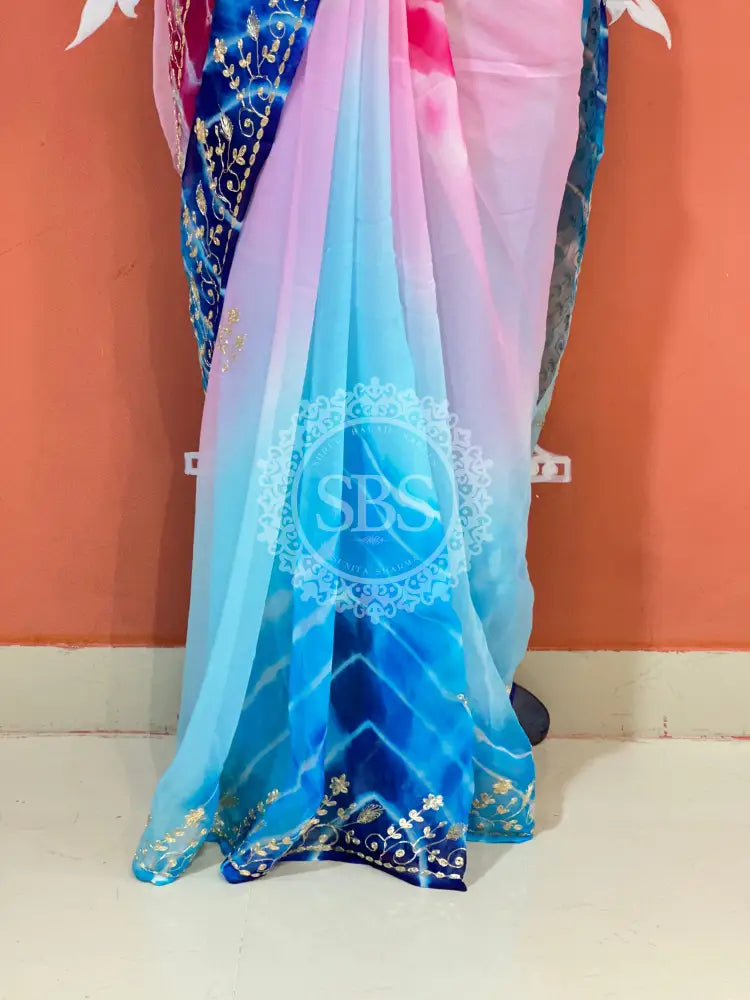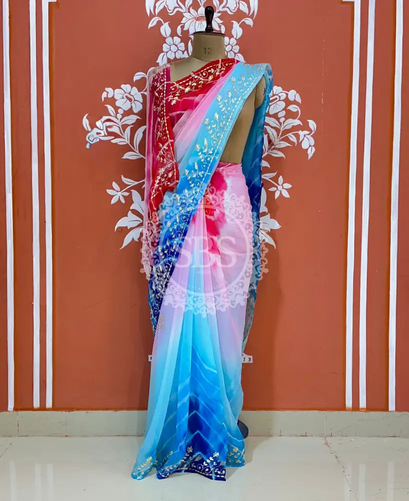 PURE DIAMOND CHIFFON PITTAN WORK SAREE Red & Blue / Free Size