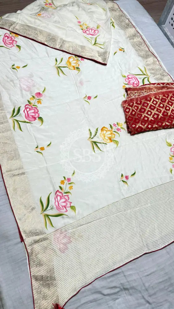 PURE RUSSIAN SILK HANDBRUSH PRINT SAREE White / Free Size