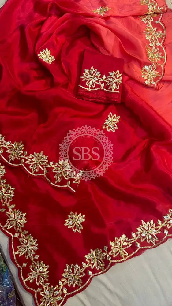 PURE UPADA SILK KACHI GOTA PATTI SAREE Red / Free Size