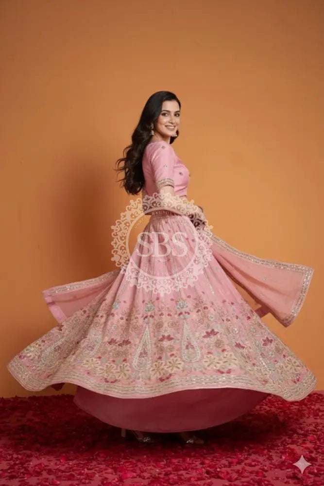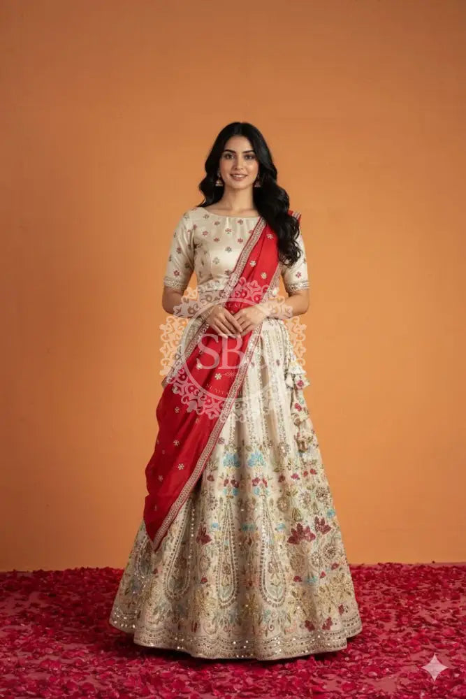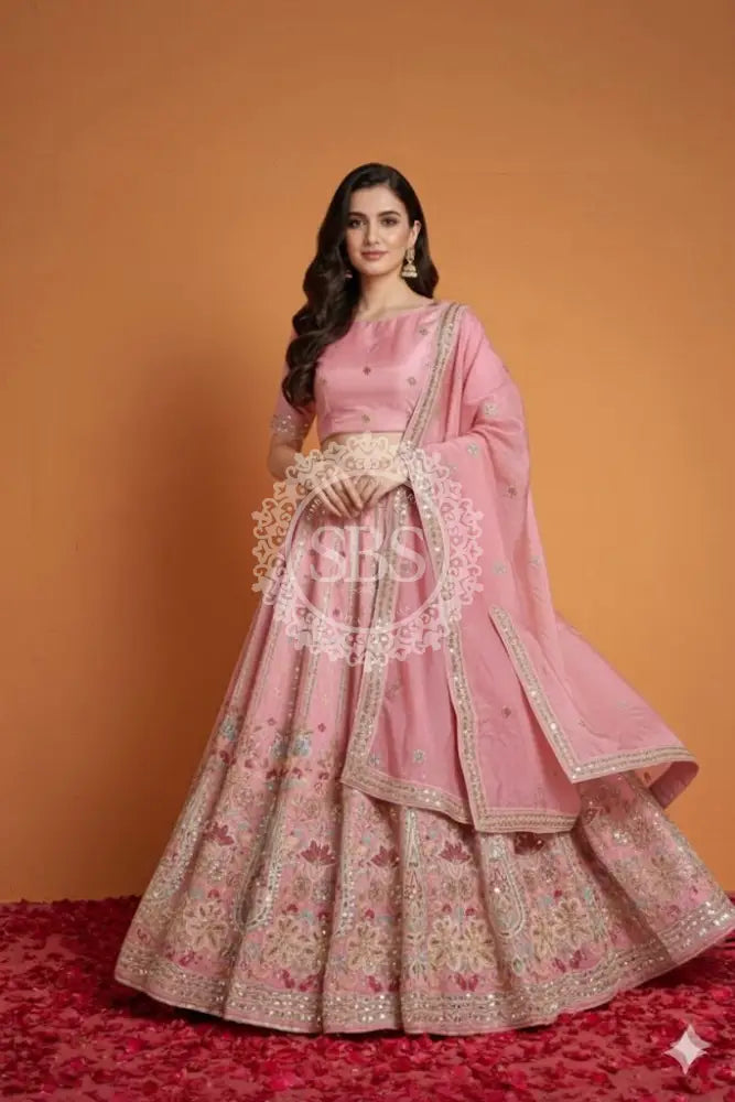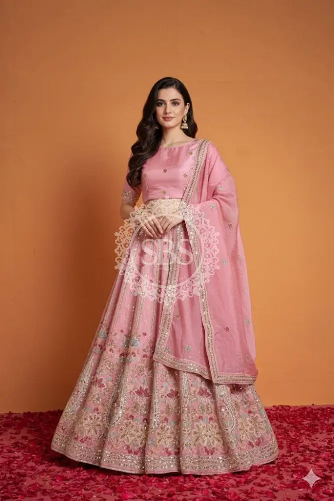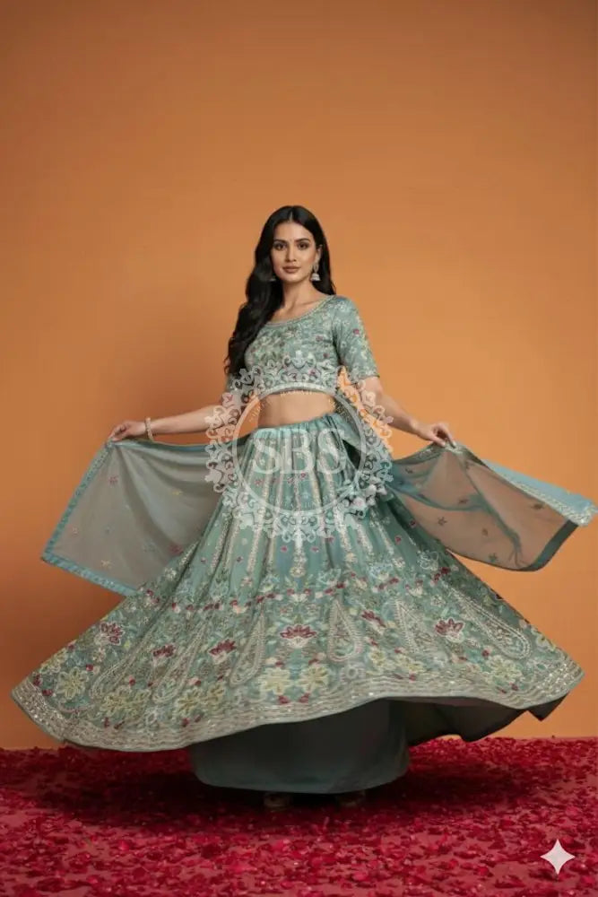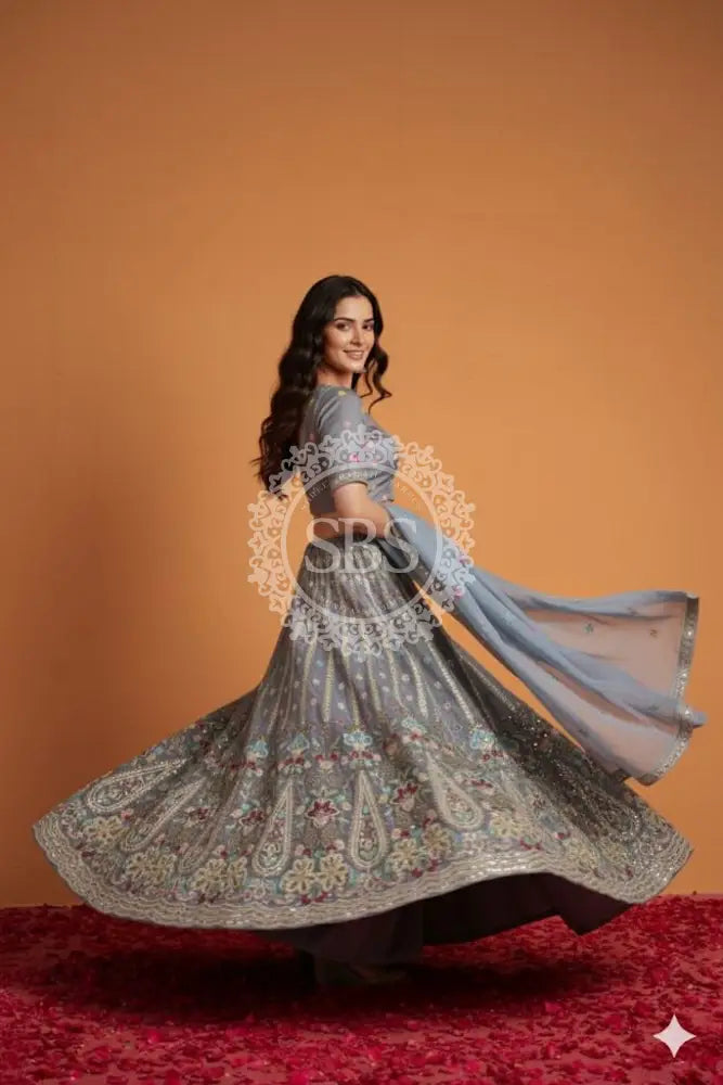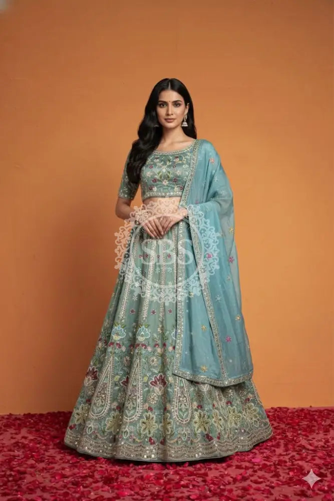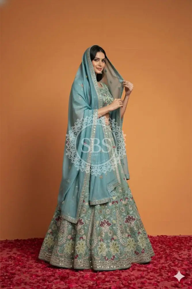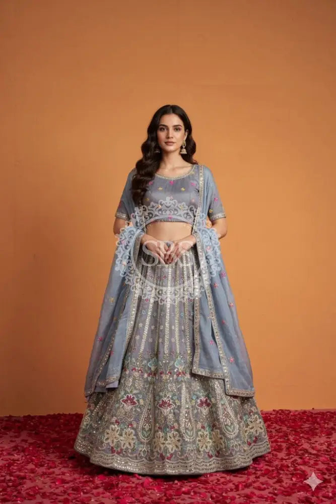 Pure Cosmos Floral Embroidery Lehenga Sky Blue