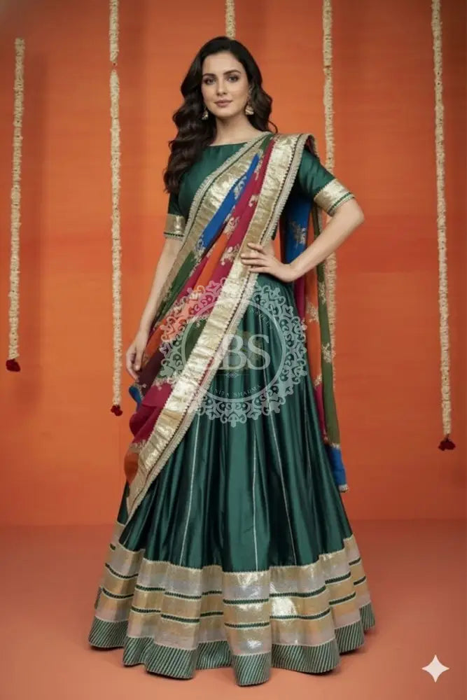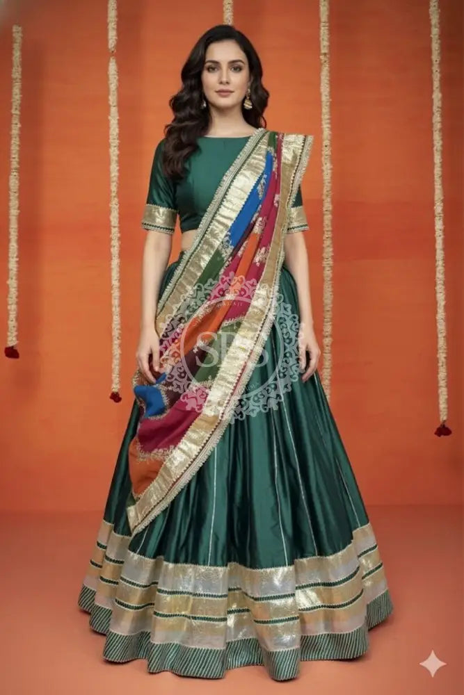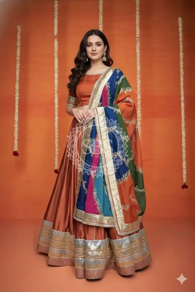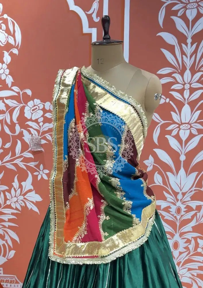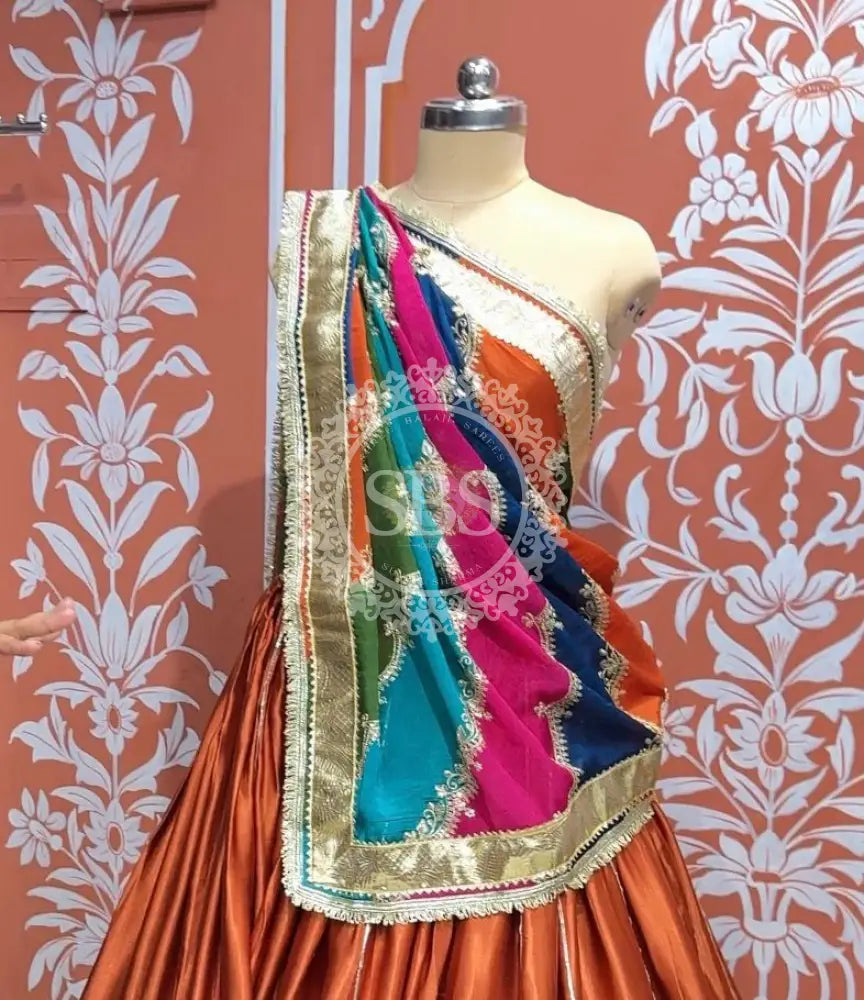 Pure Gazi Satin Silk Big Flare Lehenga with Pure Chinon Zari work Multicolour Dupatta