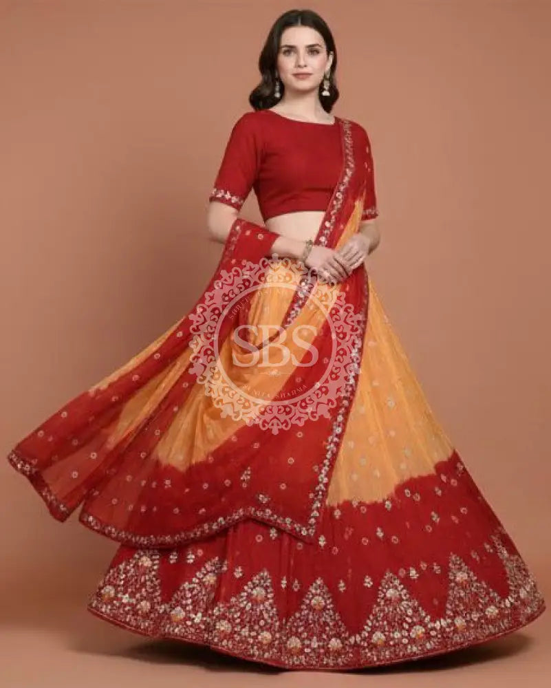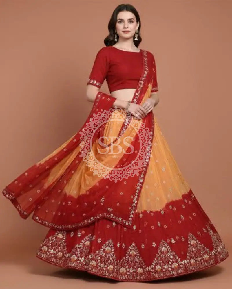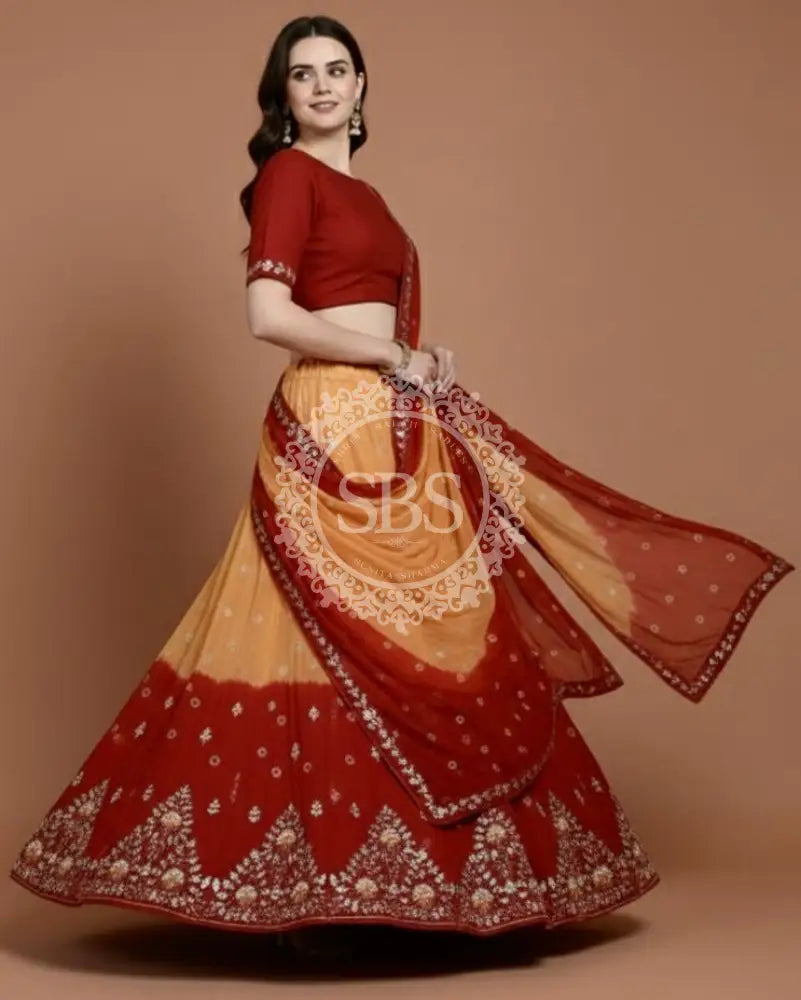 Pure Upada Silk double shade Lehenga with Bhandej and aari Tari work Peach & Red / Free Size